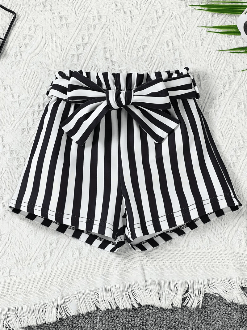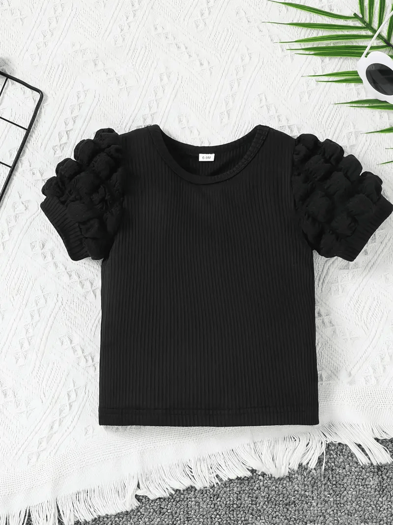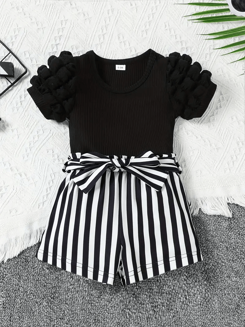 Baby Girls' Trendy Summer Outfit A stylish two-piece set featuring a round-neck, short-sleeve top with puff (lantern) sleeves made from textured popcorn fabric for a princess-style look. Paired with black and white striped shorts that include a belt, this outfit is perfect for fashionable infants (0-3 years old). Made from 100% polyester with a slight stretch, it offers softness and comfort for outdoor outings and vacations. The regular-fit, knit fabric design is machine washable and suitable for spring and summer. Origin: Guangdong, China.
