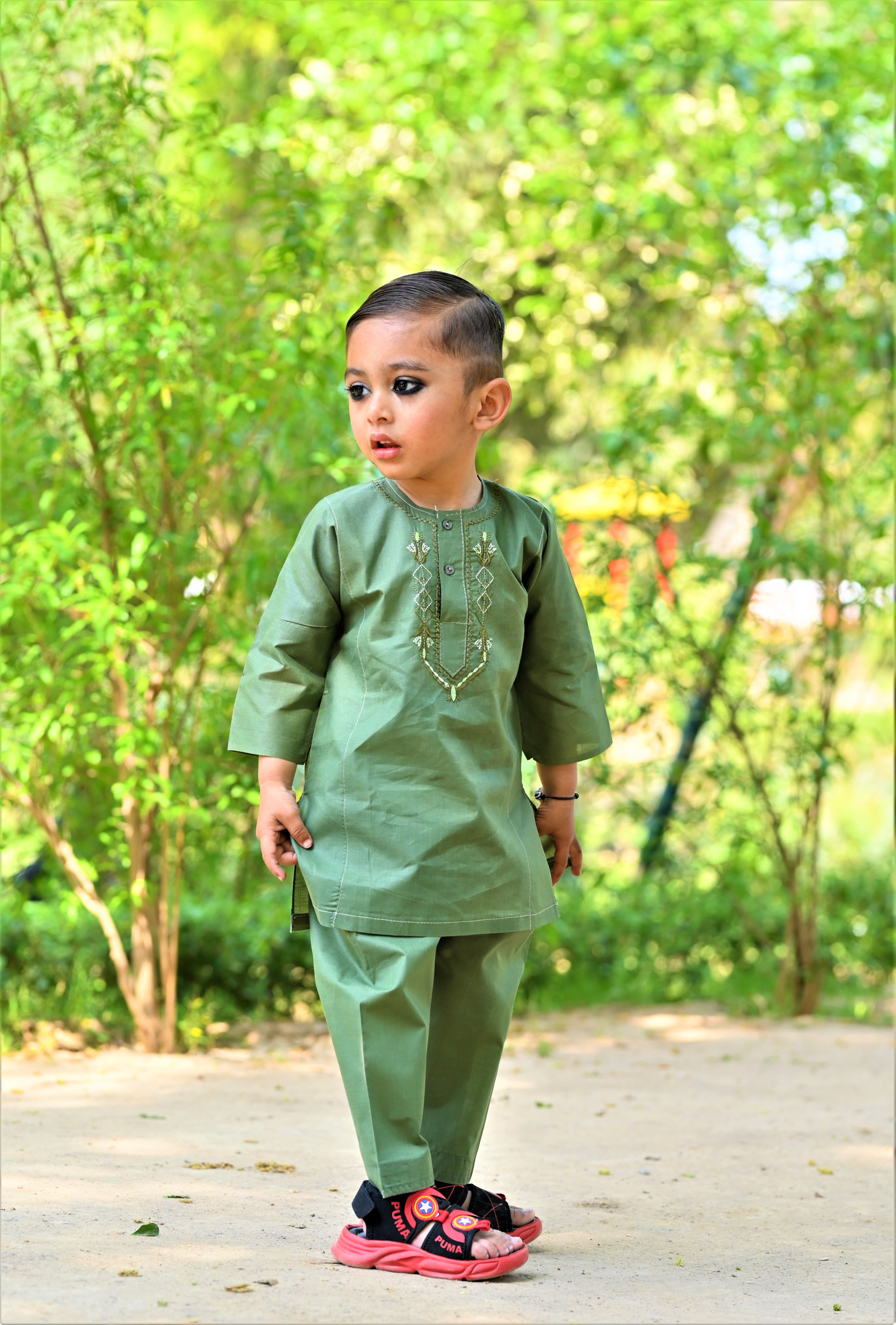 Mehndi Green Baby Boy Shalwar Kameez β Traditional Elegance for Little Ones (6M-2Y) A stylish and traditional Shalwar Kameez in a charming Mehndi Green shade, featuring intricate neck embroidery. Made from soft, breathable fabric for all-day comfort, this outfit is perfect for Eid, weddings, and cultural events. πΉ Sizes: 6 Months - 2 Years πΉ Premium Fabric & Embroidery πΉ Comfortable & Durable Stitching πΉ Ideal for Special Occasions Let your little prince shine in timeless elegance! β¨