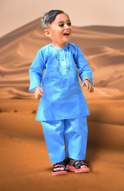 Give your little one a stylish and traditional look with this Ocean Sky Baby Boy Shalwar Kameez. Crafted from premium-quality fabric, it features intricate neck embroidery, ensuring both elegance and comfort. Perfect for Eid, weddings, and festive gatherings.