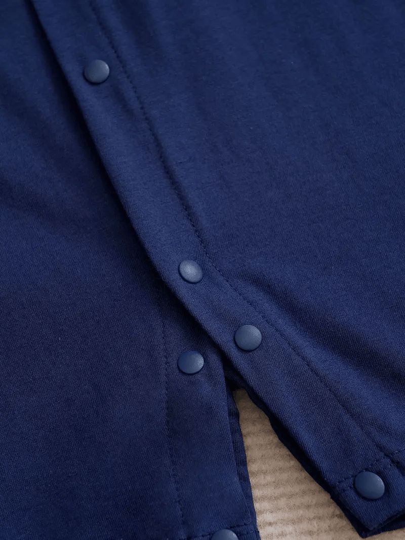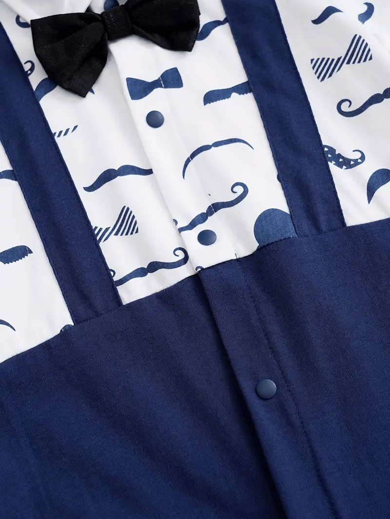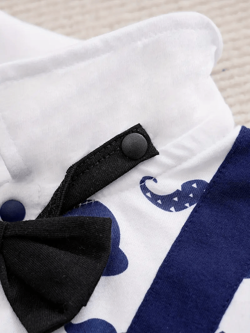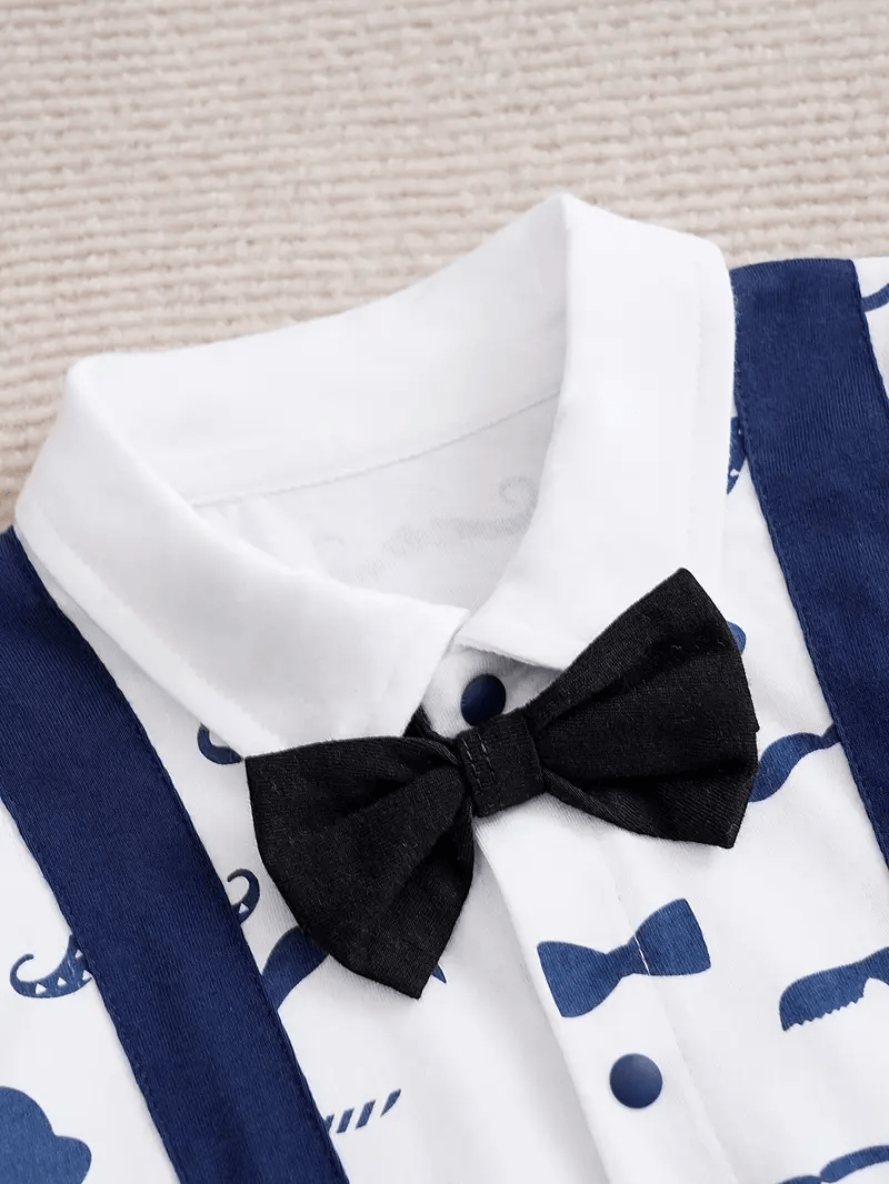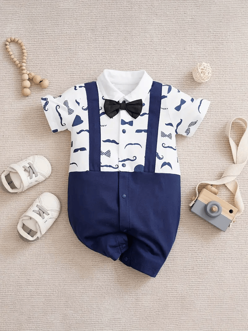 YIERYING Baby Boy's Gentleman Jumpsuit A navy blue short-sleeve romper featuring faux suspenders and a bow tie for a gentleman-style look. Made from soft and comfortable knit cotton fabric, this summer jumpsuit is perfect for casual wear and outdoor outings. Designed for baby boys, it offers a comfortable fit and an adorable, stylish appearance.